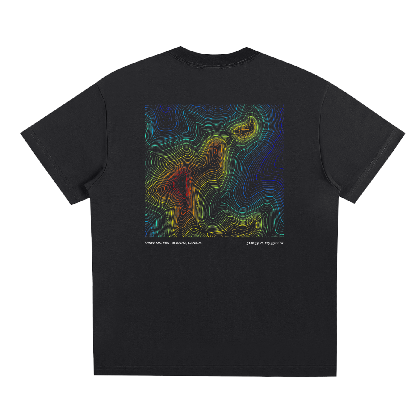 Inspired by the rugged skyline of Canmore’s Three Sisters, this technical tee features a detailed topographic map print capturing the elevation lines of Alberta’s most recognizable peaks. Built for comfort and durability, the 240 g/m² cotton blend fabric offers a breathable yet substantial feel — ideal for layering or wearing on its own through variable conditions.